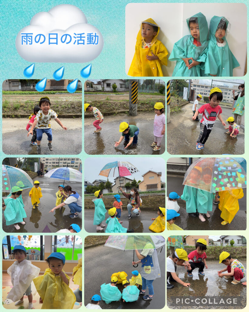 次は雨の日の活動の様子です☂️カッパを着たり、水溜まりに入ったり、キラキラの傘で遊んだりしました✨雨の日にしかできない経験ができて子ども達も嬉しそうでした☺️