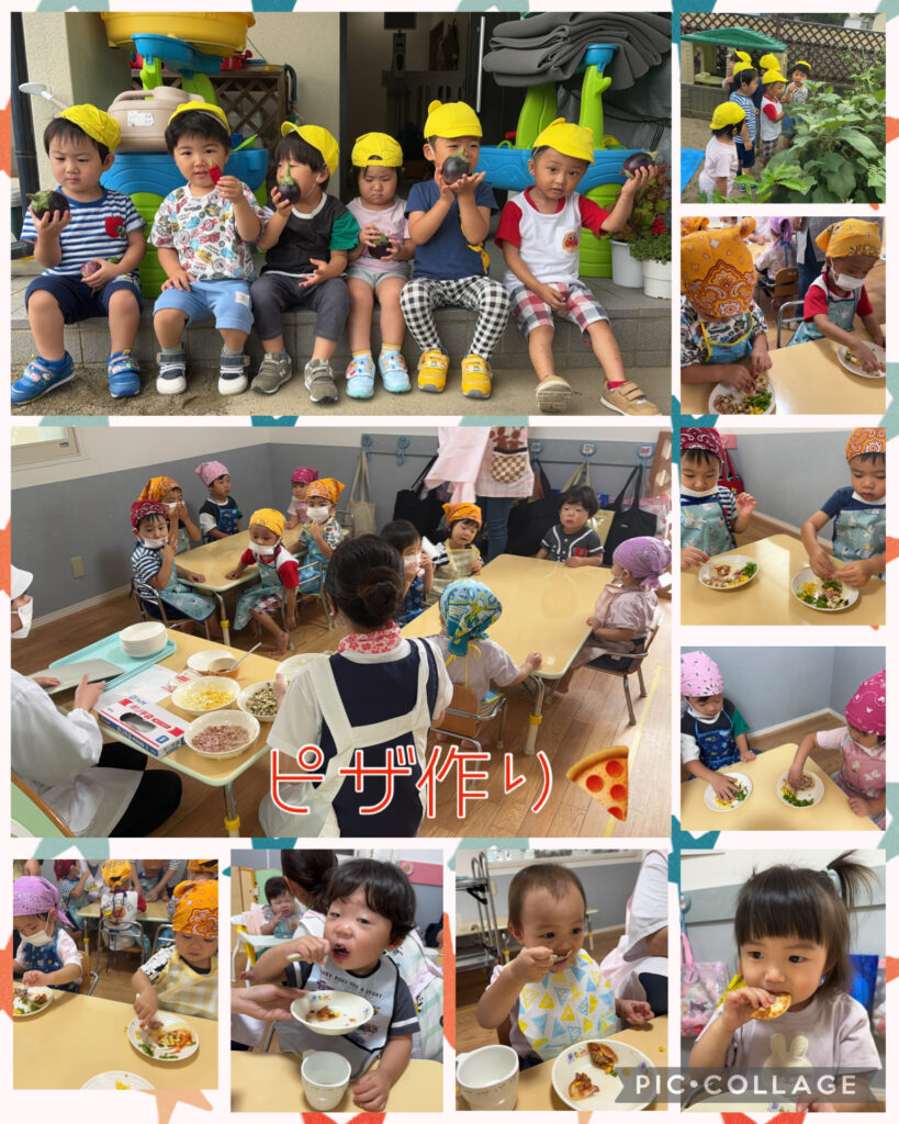 次は食育でピザを作った時の様子です🍕園庭の畑で収穫したなすやピーマンもトッピング!!野菜たっぷりでしたが、みんなとても美味しそうに食べていました😋