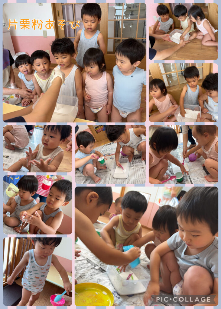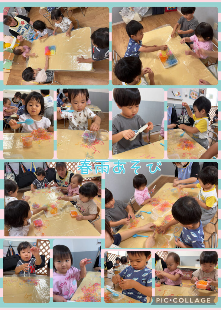 次は片栗粉遊びと春雨遊びの様子です😊様々な素材に触れ、感触の違いを楽しみました‼️