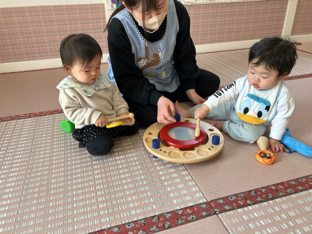 楽器遊びをしている様子です。先生が「トントントン」とやってみせると真似をして、色々な音を聞いて楽しんでいました♪お部屋中に素敵な音色が広がっていましたよ!