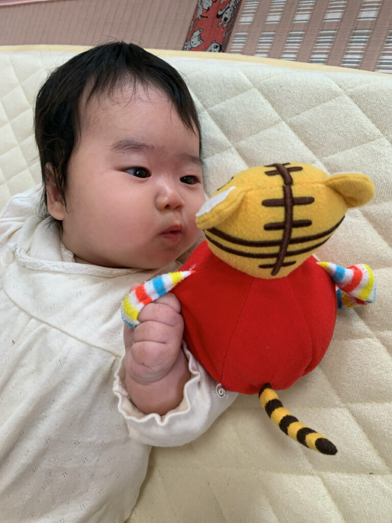 大好きなしまじろうのおもちゃで遊んでいる時の様子です。お口をパクパク動かしてまるでお話をしているようでした。とっても可愛いですね!
