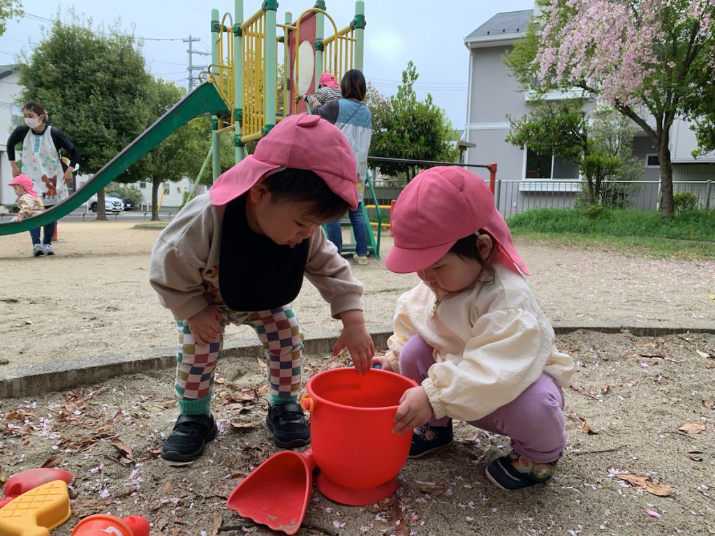 公園で仲良くお砂集めをしている時の様子です。少し前までは一人遊びが多く見られましたが、お友達と一緒に遊ぶ姿も見られてきています。微笑ましいですね!