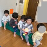 久しぶりにシャボン玉遊びをしました。風に吹かれるしゃぼん玉を「待て待て〜」と追いかけて楽しんでいたくま組さん。ストローで吹くことを先生に教えて貰い、上手に出来ていました。