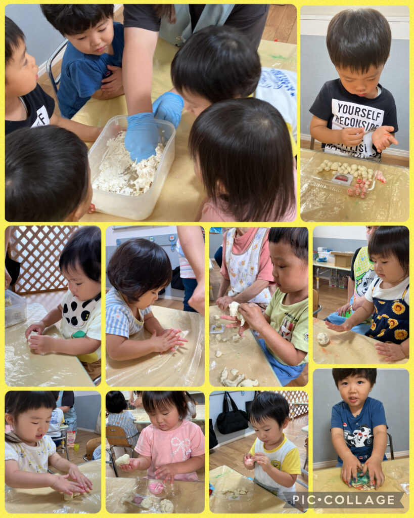 最初はお月見の様子です🎑小麦粉粘土でお団子を作りました🍡