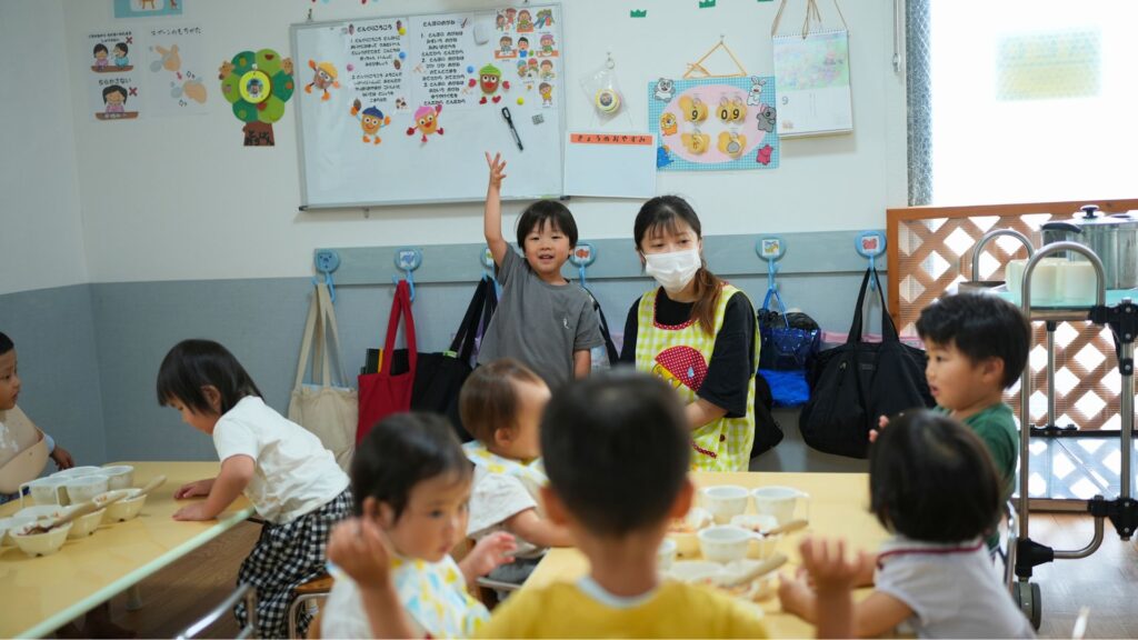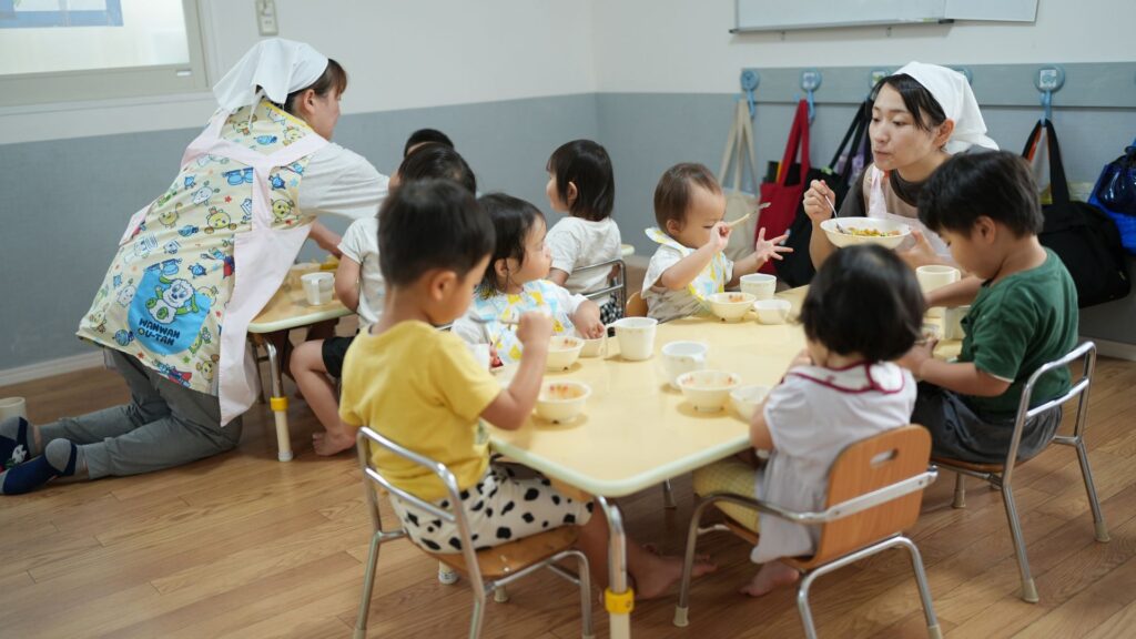 みんなで給食を食べます。かっこよく食べるお兄さん・お姉さんの姿を見て「私も」と自然と気持ちが育ちます