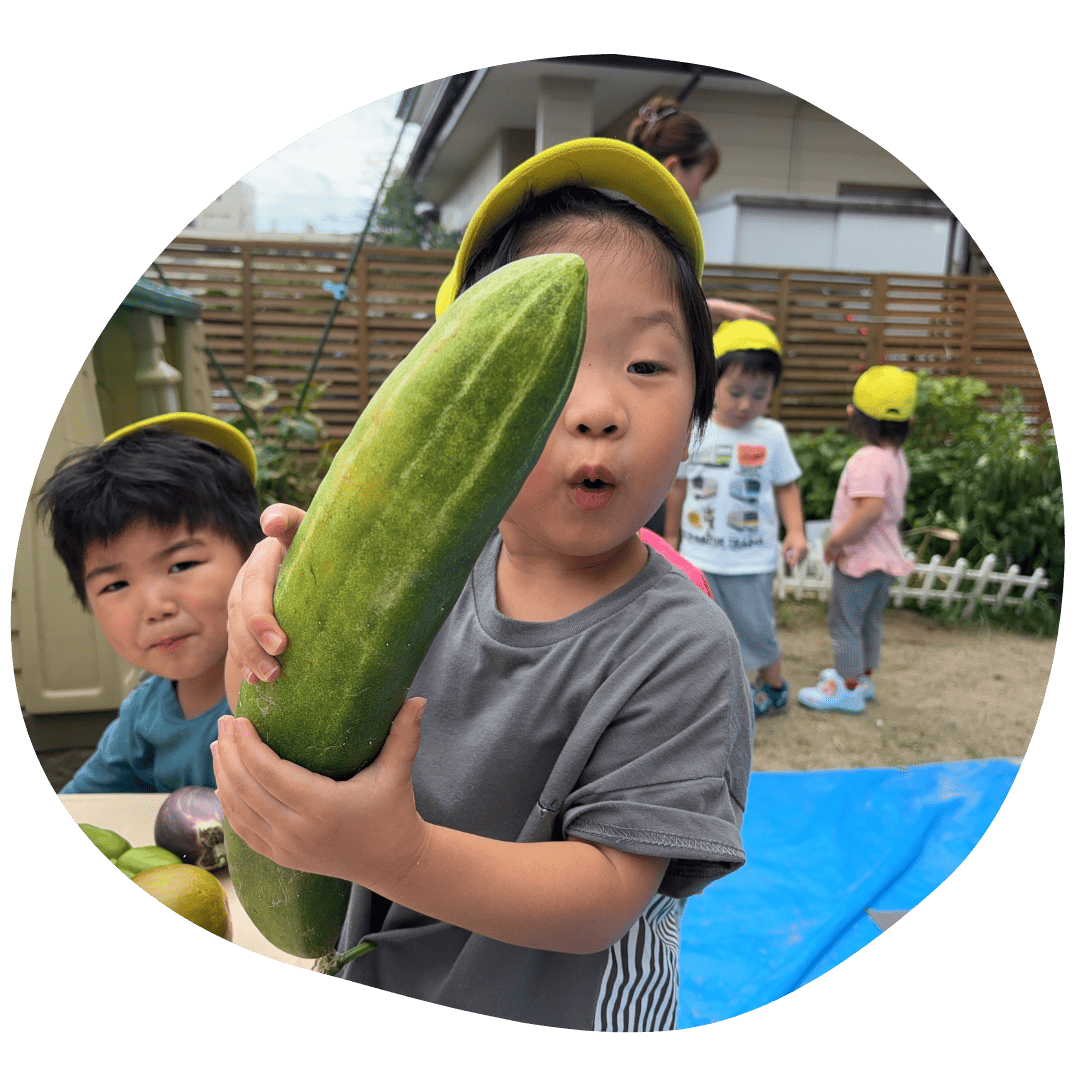 自分たちのちいさな手で、土にふれ、種をまき、いのちの成長をじっと見守る。 太陽をたっぷり浴びた野菜を収穫するときの子どもたちの誇らしげな笑顔が溢れます。